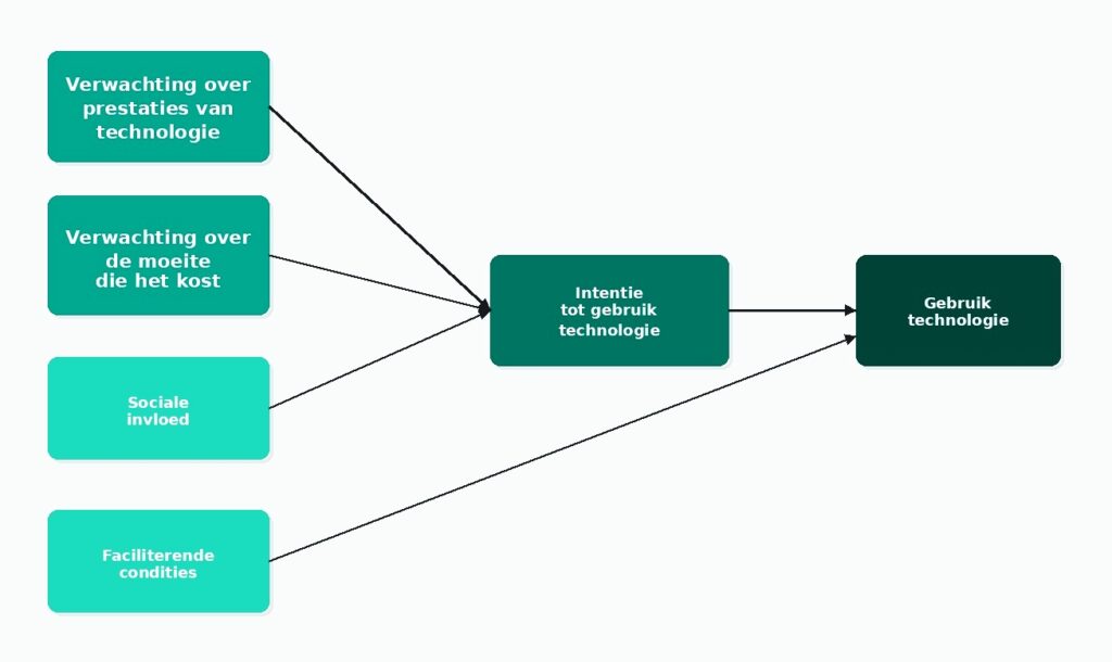 Tijdens onze sessie bespraken we het UTAUT-model (Unified Theory of Acceptance and Use of Technology) om dit te duiden. Dit model laat zien dat de adoptie van nieuwe technologie afhangt van vier factoren: