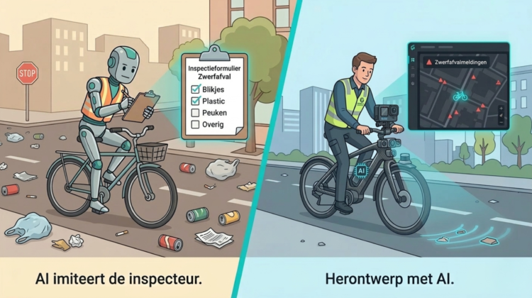 In onze presentatie openden we met een illustratie die direct de toon zette. Links: een robot op een fiets met een schouwboek. Rechts: een beheerder op een fiets met een camera en een AI-dashboard. Het verschil? De robot imiteert de inspecteur. Het herontwerp zet AI in als gereedschap.