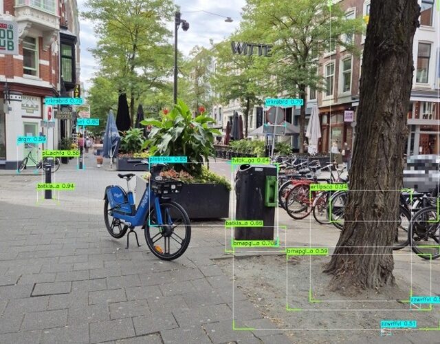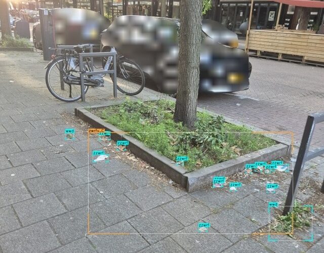 Deze opname toont een boomspiegel waar UrbanVue’s AI zowel onkruidgroei als zwerfafval detecteert. De combinatie van groene opslag en afvalresten beïnvloedt de beeldkwaliteitsscore (A t/m D).