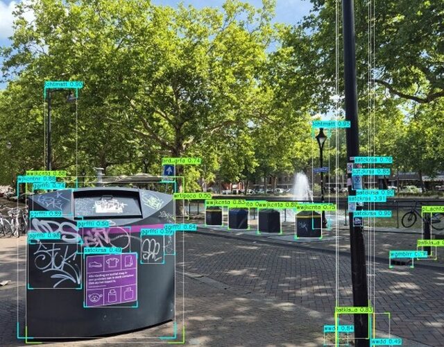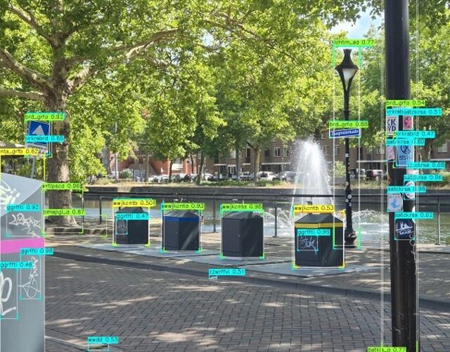 Op de voorgrond worden verschillende graffiti-tags en stickers automatisch gedetecteerd, waarmee vervuiling op gemeentelijke objecten objectief kan worden vastgelegd.